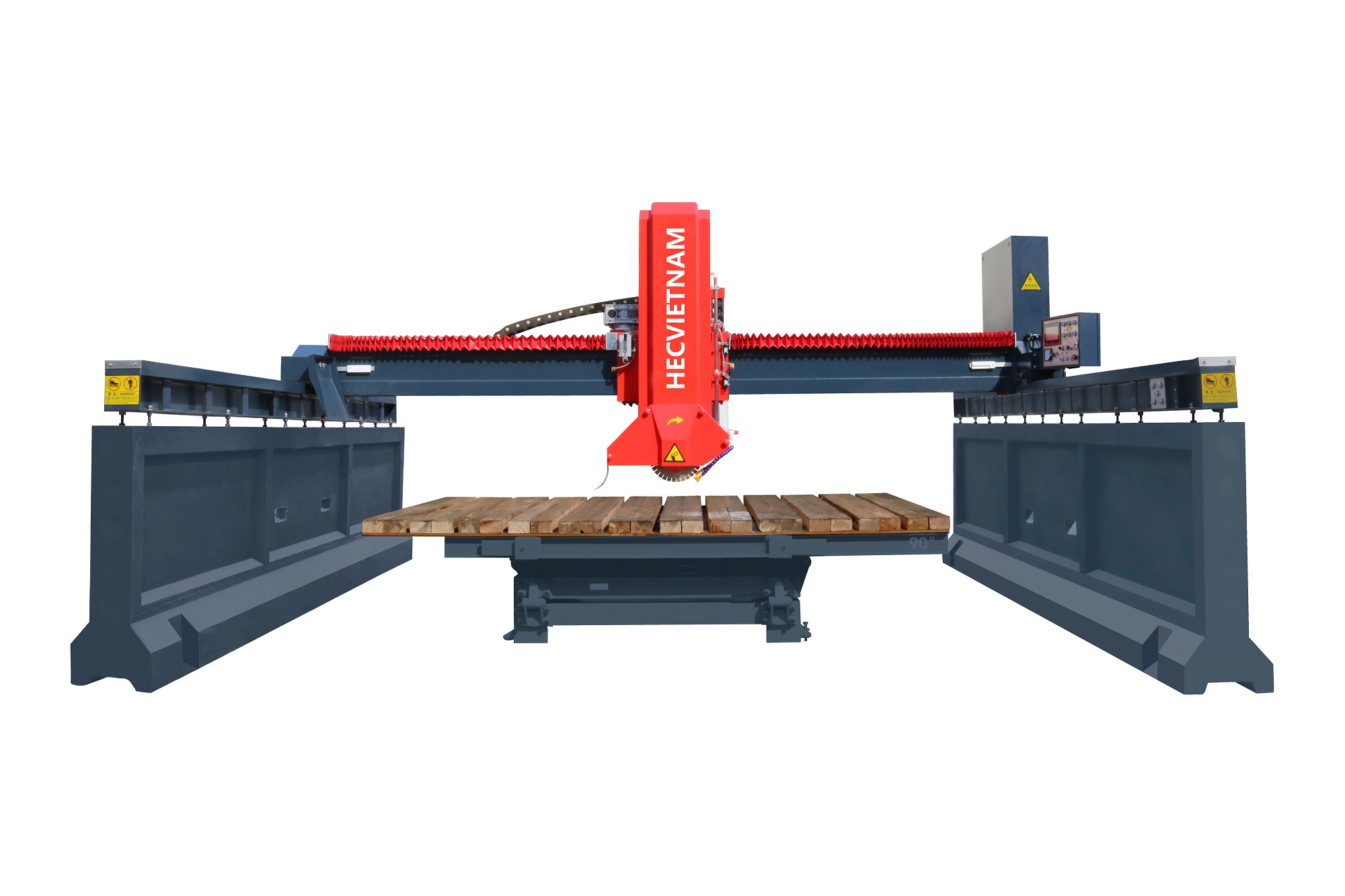 Bàn máy kết hợp sử dụng thanh gang đặc và gang tấm, đảm bảo cho bề mặt tiếp xúc của bánh xe bàn máy và mặt gang tiếp xúc tốt nhất, tránh tính trạng bàn máy bị cao thấp, gây hao tổn bàn gỗ cũng như độ chính xác khi cắt đá